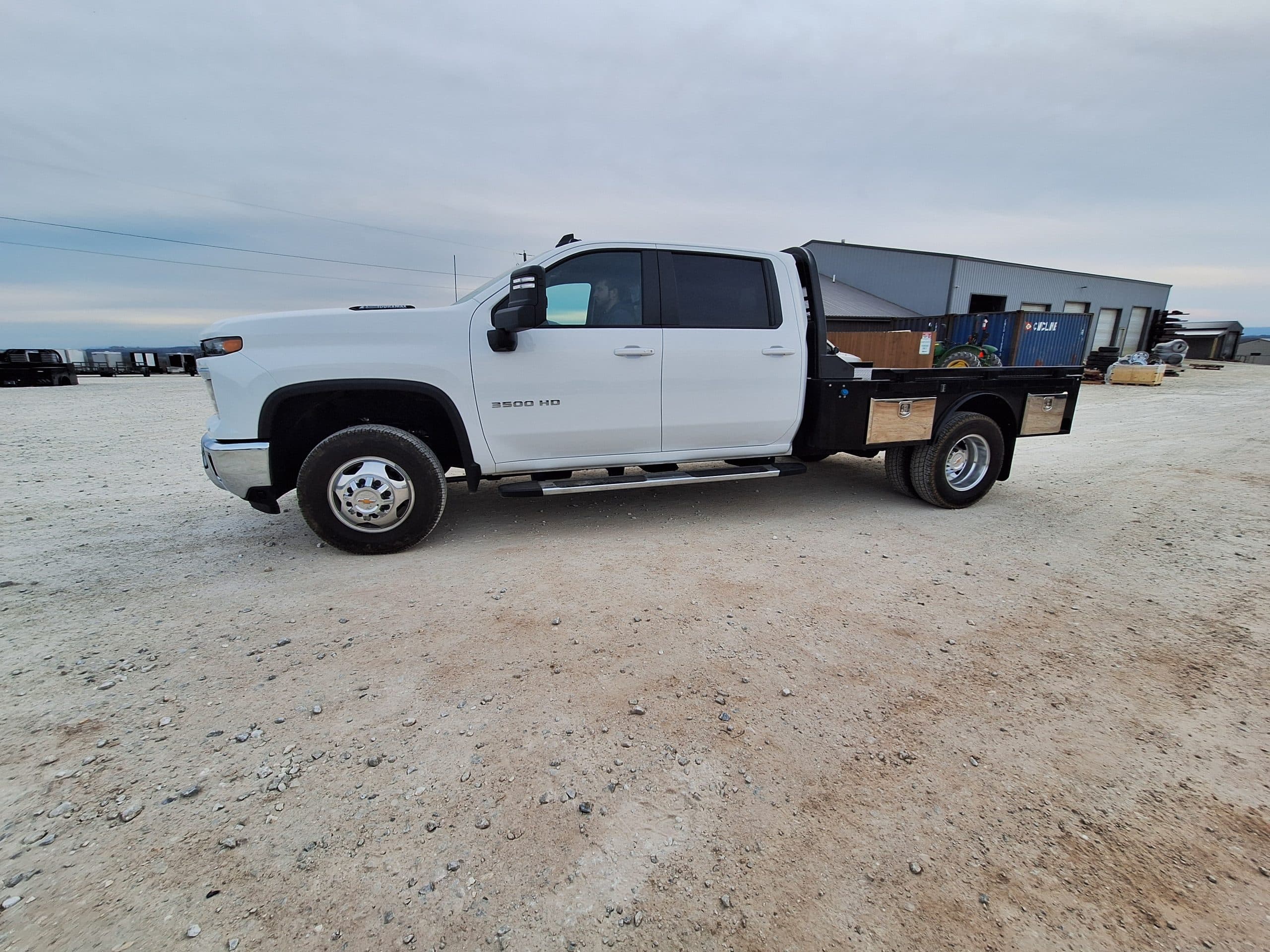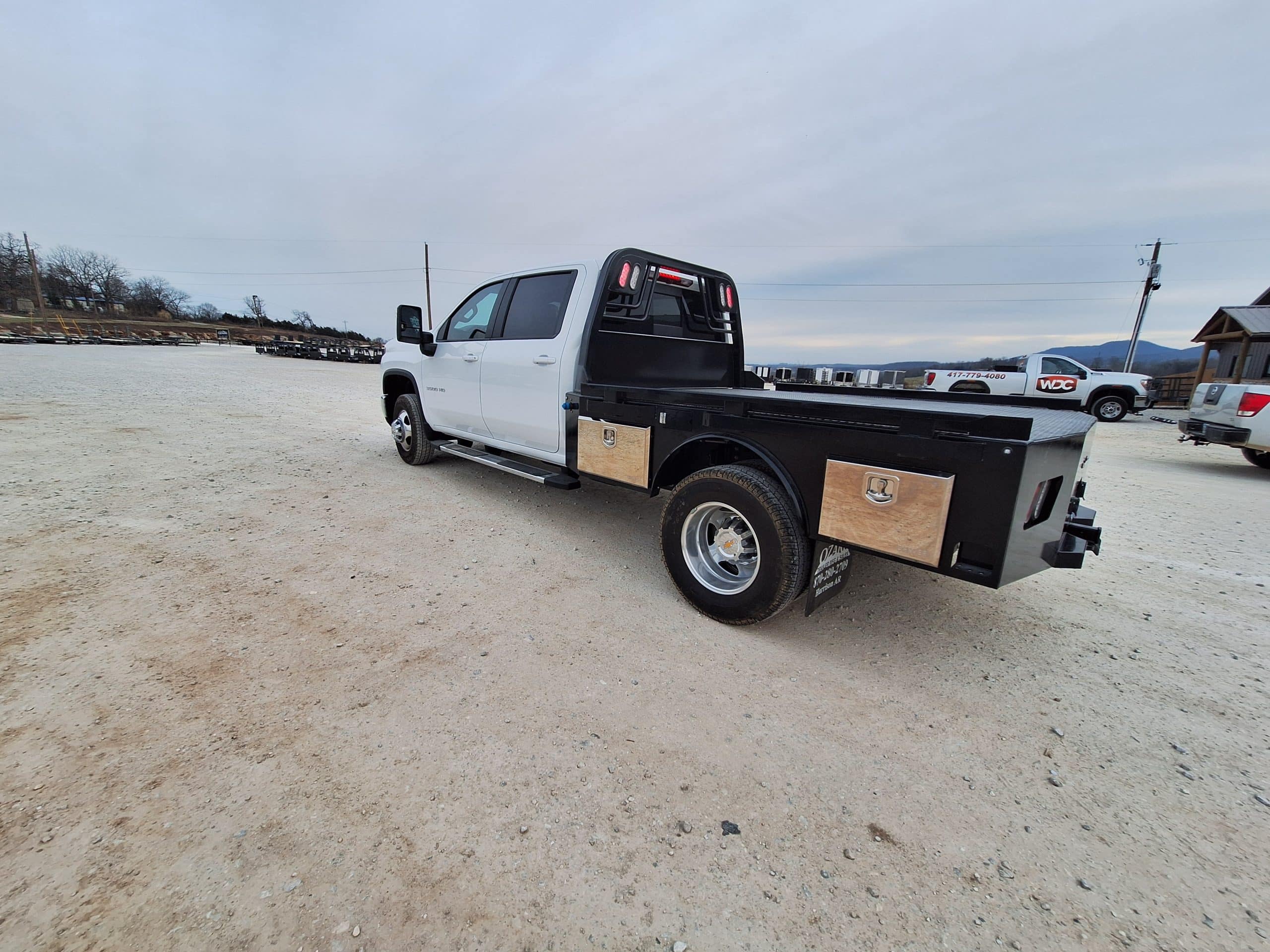 Cash/Check Price: $4,450 Before Taxes and Installation Taxes are not included in sale price. Farm Tax Exemption forms are available upon pickup. Call or Email Installation = $650 Bed Removal = $150 Backup Camera = $125 Sensors = $100 Fit a Ford/Dodge/GM/Chevy Dually Features: Steel Structural Frame 1/8″ Steel Diamond Plate Floor Angled Fuel Filler Neck & Def Ready Class 4 Receiver Hitch Ready Black Powder Coat 6″ Oval LED Reverse Lights Single LED License Plate Light Molded Sealed Harness 3″ Removable Side Rails 4″ Runner Channels Steel Tube Headache Rack with Cross Bars, Lights 30K Rated Built in Gooseneck Well with Welded Ball Skirted Rear Bumper Smooth Flare Fenders LED Marker Lights 6″ Oval LED Stop/Tail/Turn Lights All Lighting DOT Complaint 7 Way Receiver Female Plug 4 Built in Toolboxes Bed Weight = 1600LBS Cab to Axle = 57″ Length = 102″ Width = 97″ If Bed shows out of stock, give our sales staff a call to find out how to custom order your own!
