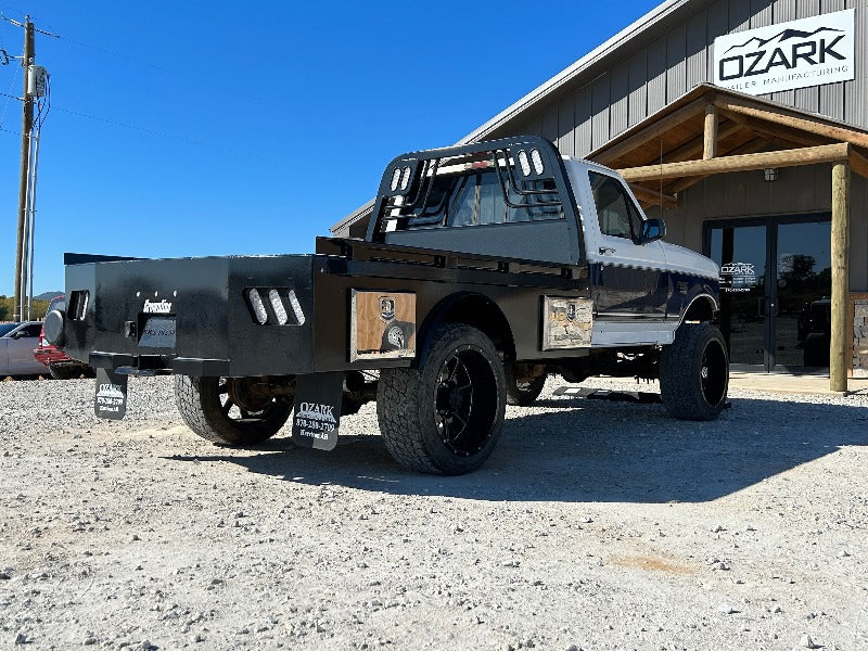 Cash/Check Price: $4,450 Before Taxes and Installation Taxes are not included in sale price. Farm Tax Exemption forms are available upon pickup. Call or Email Installation = $650 Bed Removal = $150 Backup Camera = $125 Sensors = $100 Fits a Long Bed Ford 1998- Present and a Long Bed Chevy 2001-Present Features: Steel Structural Frame 1/8″ Steel Diamond Plate Floor Angled Fuel Filler Neck & Def Ready Class 4 Receiver Hitch Ready Black Powder Coat 6″ Oval LED Reverse Lights Single LED License Plate Light Molded Sealed Harness 3″ Removable Side Rails 4″ Runner Channels Steel Tube Headache Rack with Cross Bars, Lights 30K Rated Built in Gooseneck Well with Welded Ball Skirted Rear Bumper Smooth Flare Fenders LED Marker Lights 6″ Oval LED Stop/Tail/Turn Lights All Lighting DOT Complaint 7 Way Receiver Female Plug 4 Built in Toolboxes Bed Weight = 1500LBS Cab to Axle = 56″ Length = 102″ Width = 84″ If Bed shows out of stock, give our sales staff a call to find out how to custom order your own!